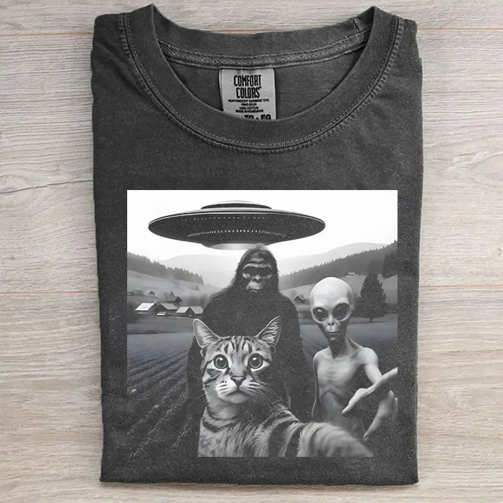 Funny Cat Kitten Selfie With Bigfoot Alien UFO T-Shirt